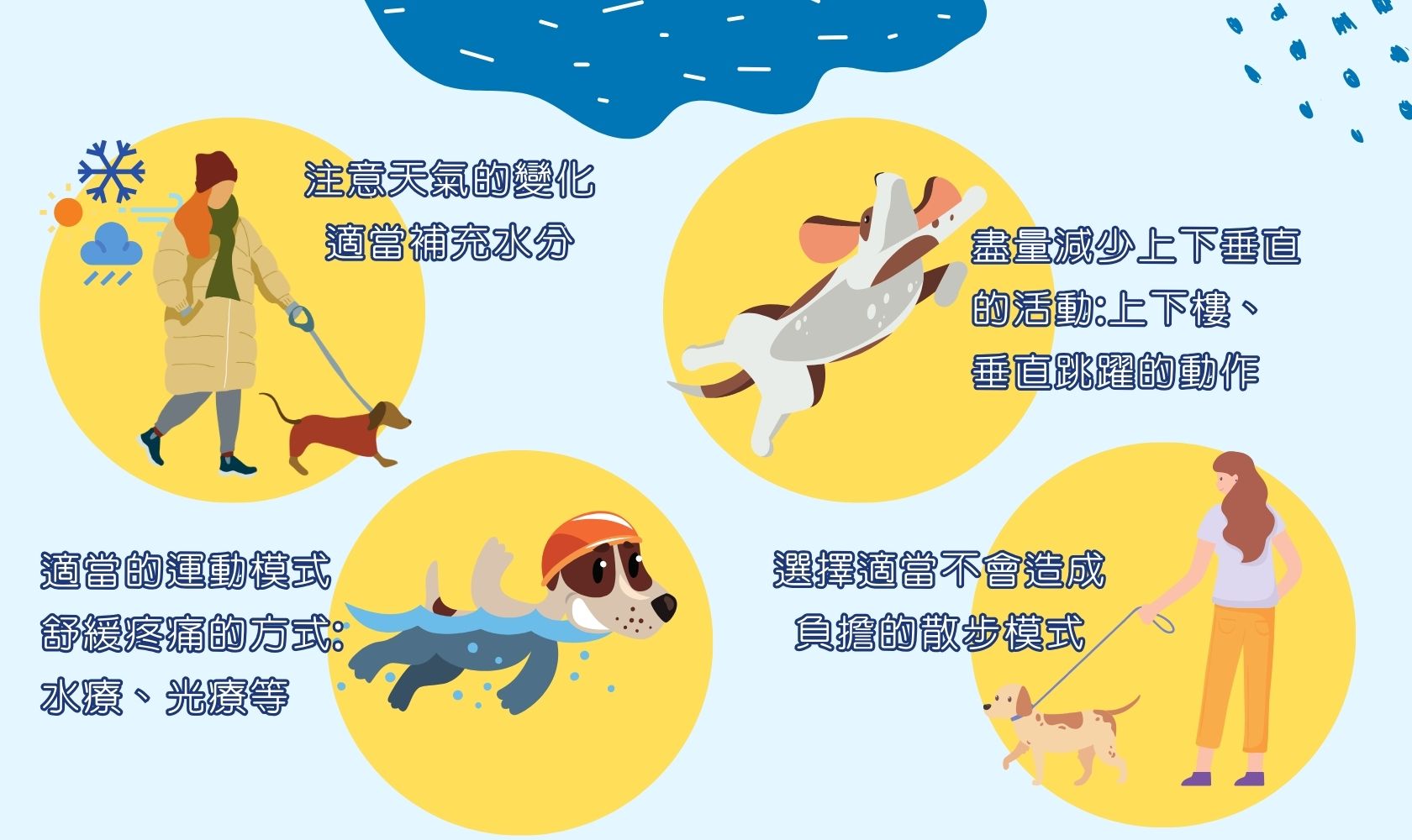 -盡量減少上下垂直的活動例如:上下樓、跳躍等動作 造成關節的壓迫與傷害