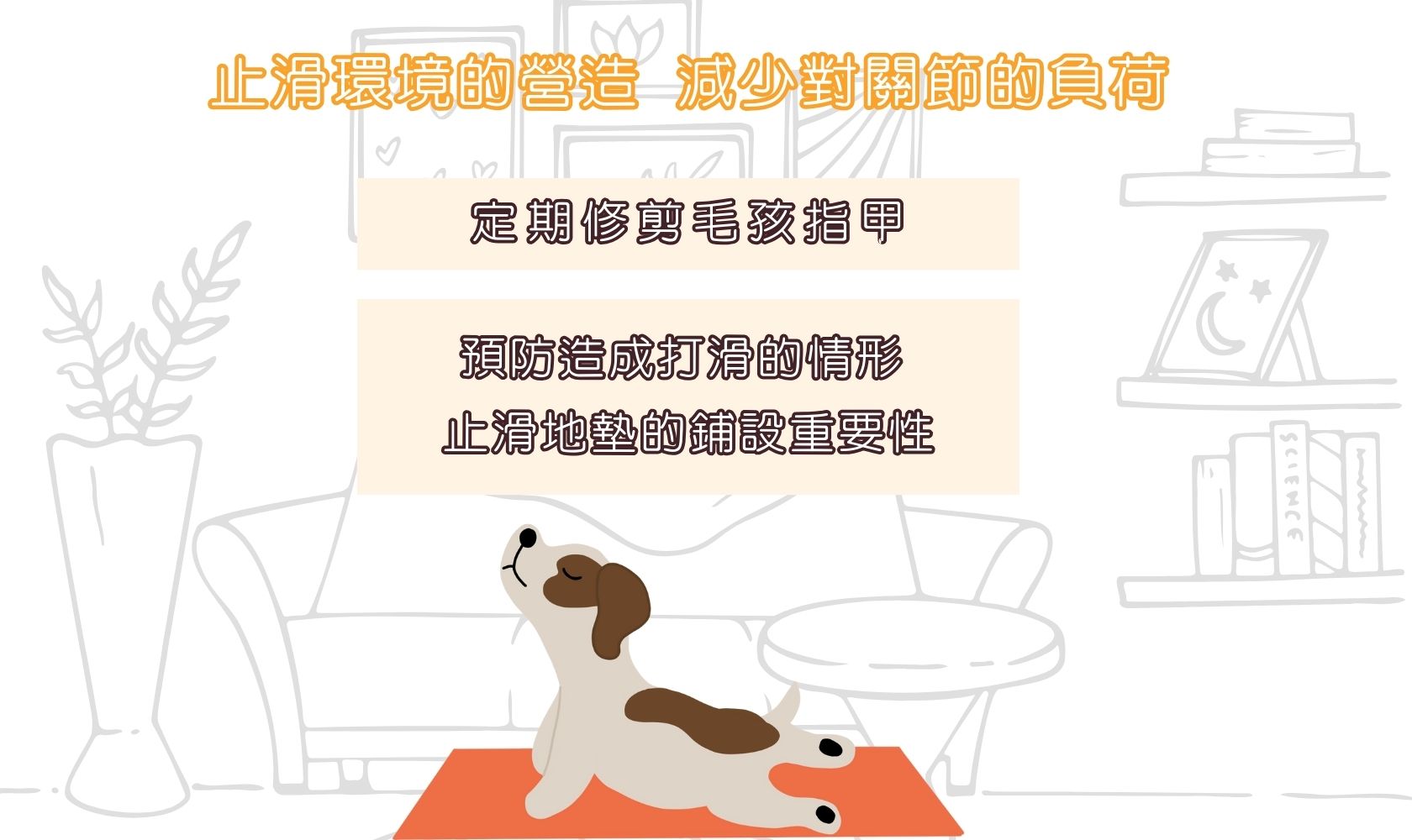-定期修剪毛孩的指甲,降低因為指甲過長影響抓地力而打滑的情形