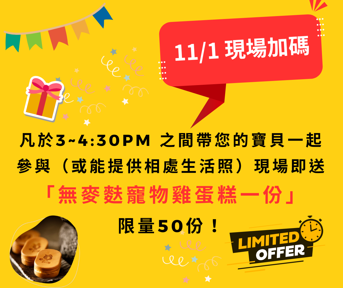 11/1當天歡迎帶毛孩來現場不僅能免費兌換限量的專屬寵物食用雞蛋糕,