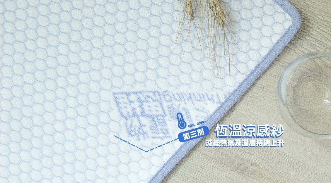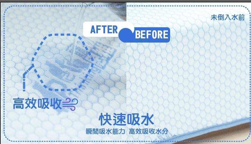 -遇水瞬吸,中間夾層為通氣材質, -增添涼感紗,背面防水透氣,增加空氣流通性 -洗後陰乾重複使用,既省錢又環保